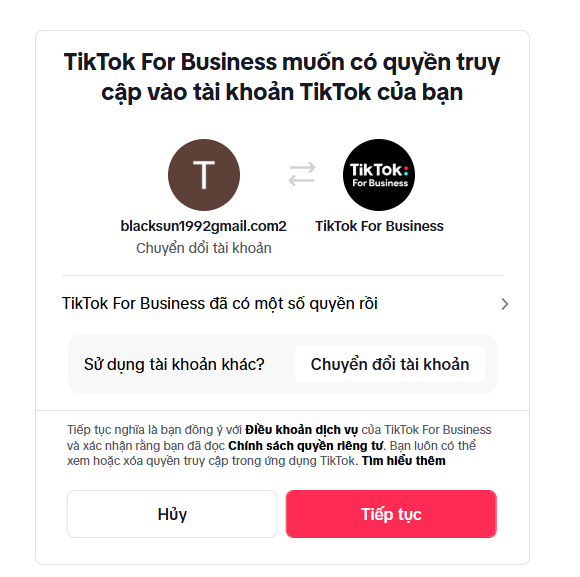 - Đăng nhập tài khoản TikTok và cấp quyền TikTok Business truy cập vào tài khoản TikTok của bạn