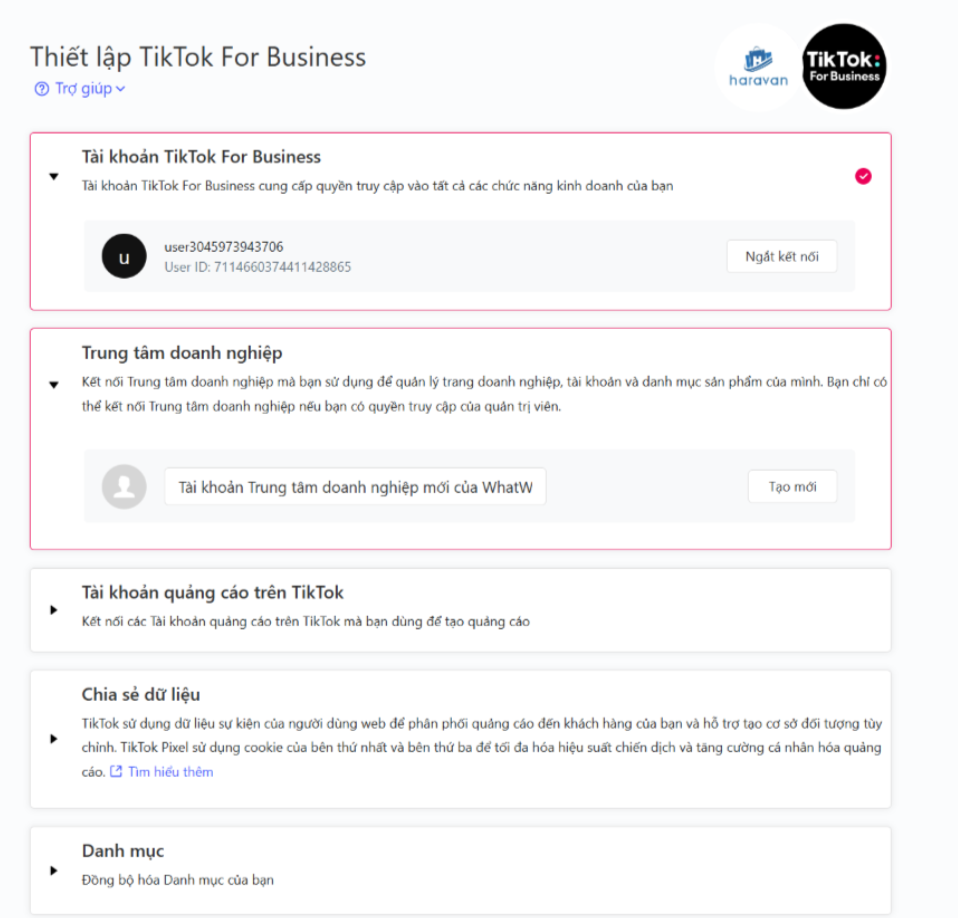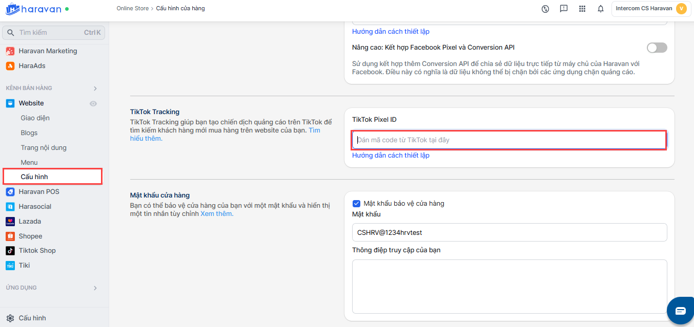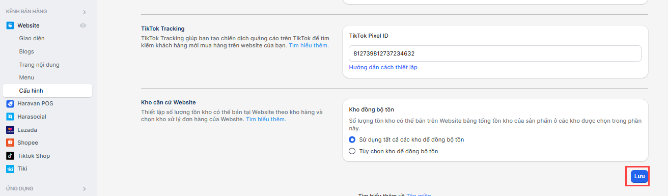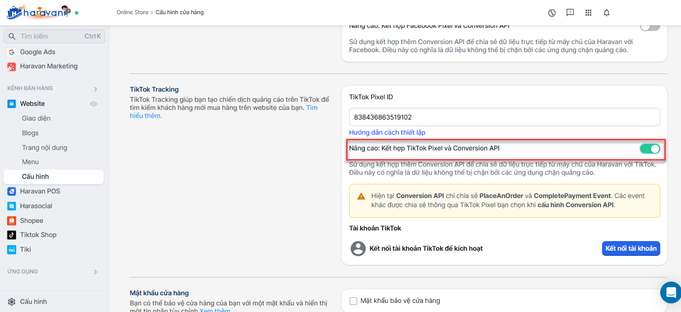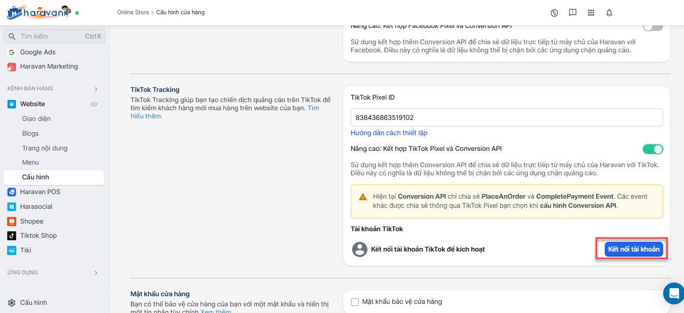 Để kết nối API sự kiện TikTok trên website Haravan, bạn thực hiện: