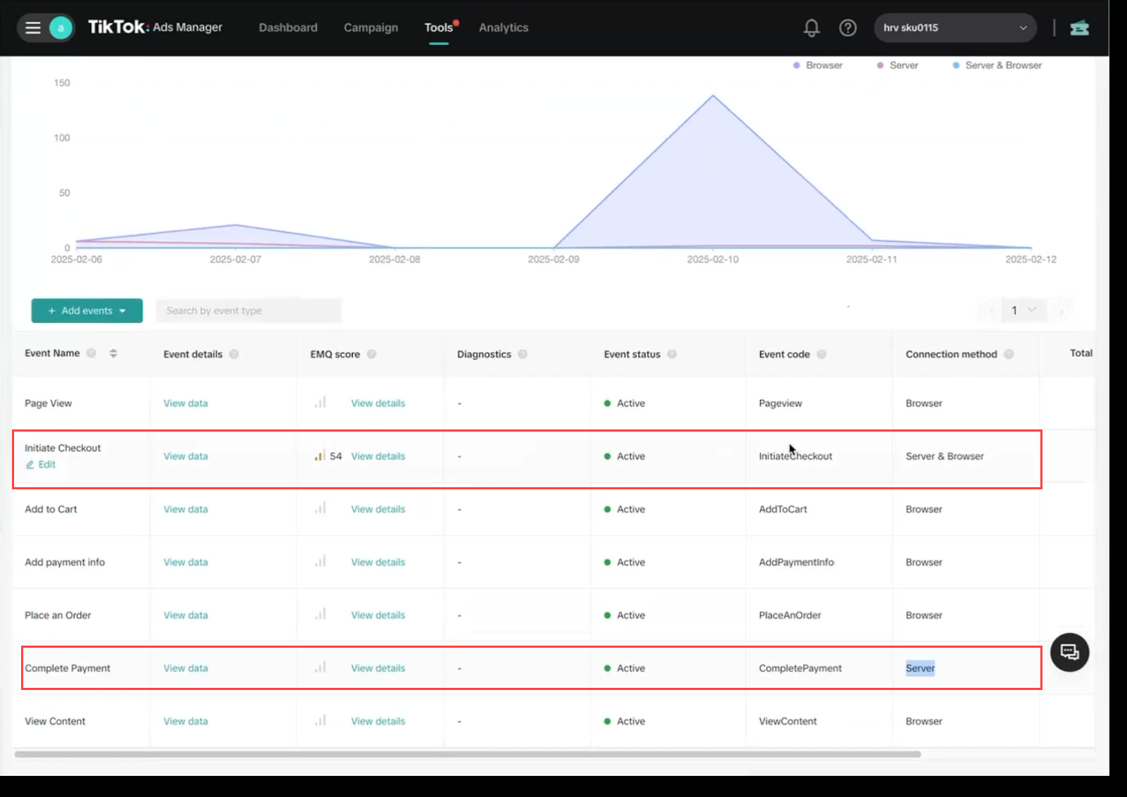 Khi khách hàng thực hiện thao tác "InitiateCheckOut" hoặc "CompletePayment" trên website, các sự kiện này sẽ được gửi về TikTok Pixel. Nhà bán hàng có thể theo dõi dữ liệu sự kiện đã được gửi lên TikTok tại TikTok Ads Manager: