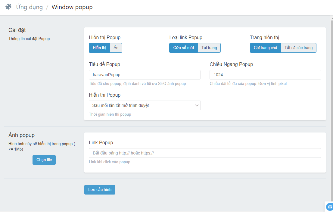 - Chiều Ngang Popup: Đây là chiều dài tối đa của popup, được tính bằng đơn vị pixel.