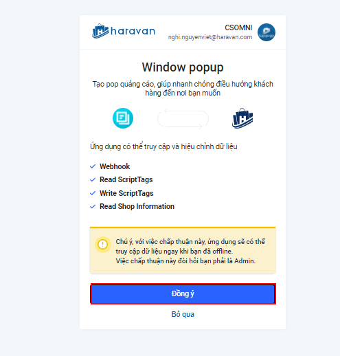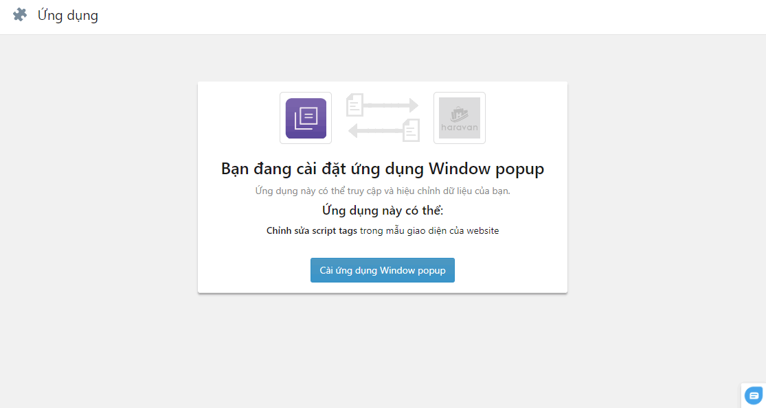Hệ thống điều hướng về Trang quản trị Haravan. Tại đây, Nhà bán hàng chọn "Cài đặt ứng dụng Window Pop-up".