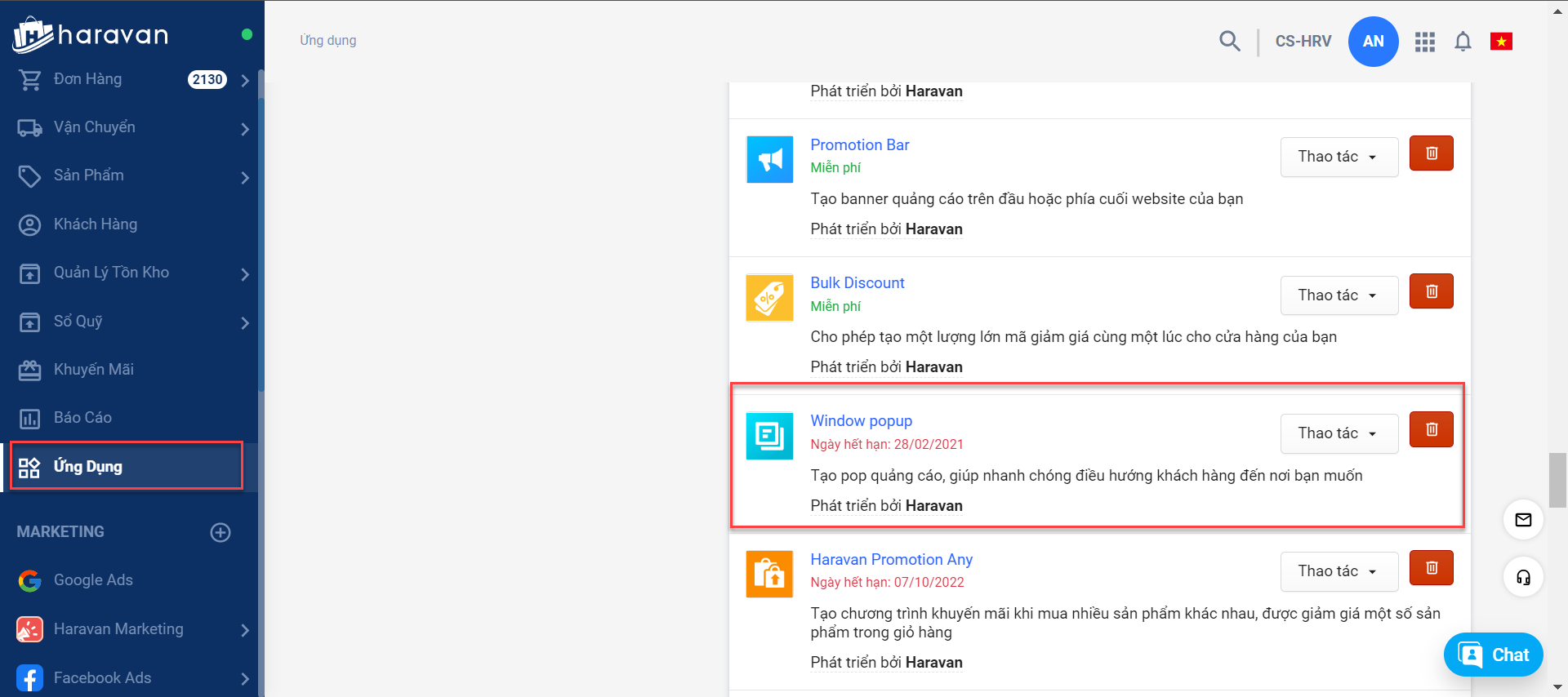 Để sử dụng ứng dụng, Nhà bán hàng truy cập vào Trang quản trị Haravan > Ứng dụng > Pop-up Window.
