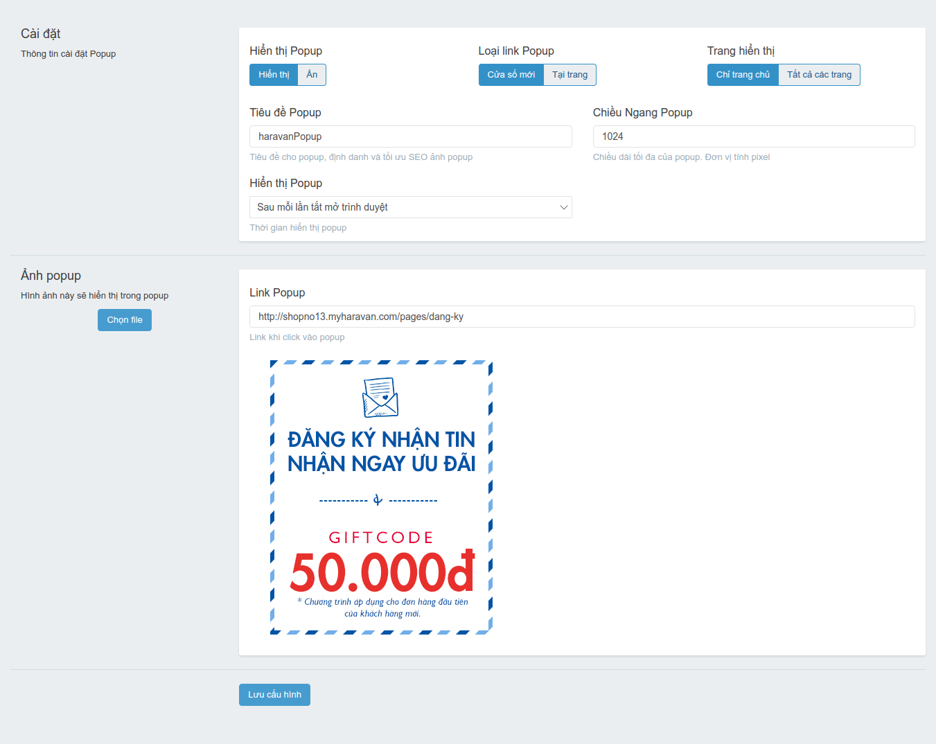 - Link Popup: Nhà bán hàng dán liên kết vào ô.