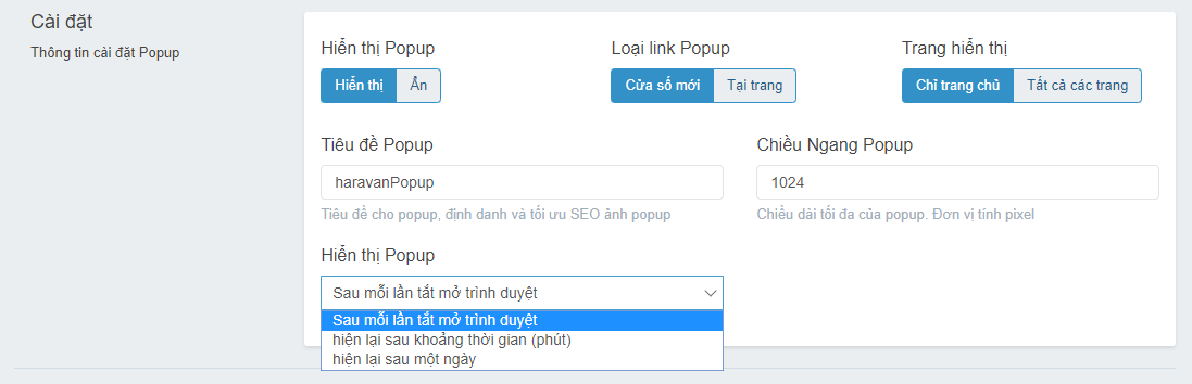 Hiện lại sau khoảng thời gian (phút): Nếu Nhà bán hàng chọn chế độ này, Nhà bán hàng cần nhập thêm thời gian (phút) cho pop-up.