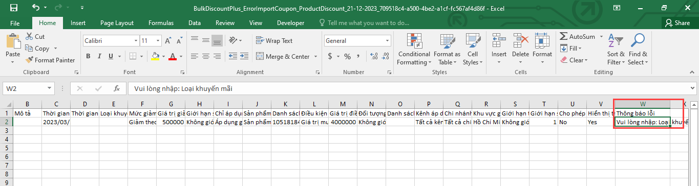 | Thông tin trên cột không đúng định dạng hoặc không đúng giá trị ứng dụng quy định. Hoặc trường hợp vượt quá giới hạn số cho phép (giới hạn về tổng số lần áp dụng khuyến mãi, số lần mỗi khách hàng có thể sử dụng khuyến mãi,...) | Vui lòng nhập đúng định dạng: [a, b, c] (*) a, b, c là tên các trường bị lỗi định dạng | 1. Với cột thông tin về thời gian, nhà bán vui lòng kiểm tra thông tin đã đúng với định dạng yyyy/mm/dd hh:mm chưa _ Định dạng đúng: 2023/02/18 09:00 SA _ Định dạng sai: 2023/2/18 09:00 SA; 2023/03/18 09 SA; 2023/03/18 09:00 Sáng,.... 2. Những cột thông tin khác nhà bán kiểm tra nội dung nhập đã trùng khớp hoàn toàn với hướng dẫn được gắn trên tiêu đề cột chưa Ví dụ: Giảm theo số tiền (đ) nhưng nhà bán nhập Giảm theo số tiền cũng sẽ bị lỗi định dạng 3. Kiểm tra những cột về số lần sử dụng khuyến mãi hoặc kiểm tra các giá trị số có phải là số dương hay không |