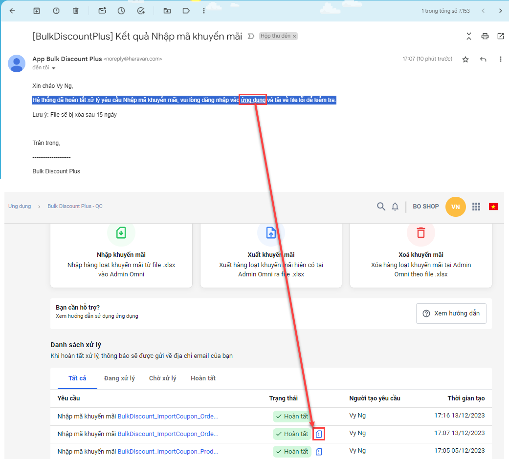 - Nếu có lỗi trên file nhập, email sẽ thông báo "Hệ thống đã hoàn tất xử lý yêu cầu Nhập mã khuyến mãi, vui lòng đăng nhập vào ứng dụng và tải về file lỗi để kiểm tra". Bạn bấm vào chữ "ứng dụng" và chọn vào Tải file lỗi