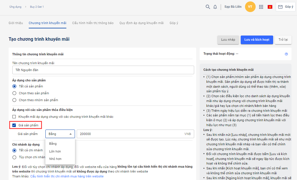 - Khi thiết lập điều kiện giá sản phẩm, các sản phẩm không thỏa điều kiện mức giá sẽ bị loại khỏi danh sách khuyến mãi