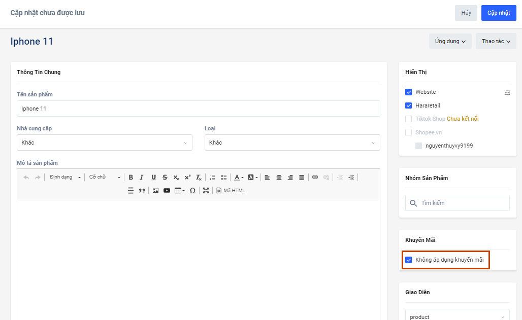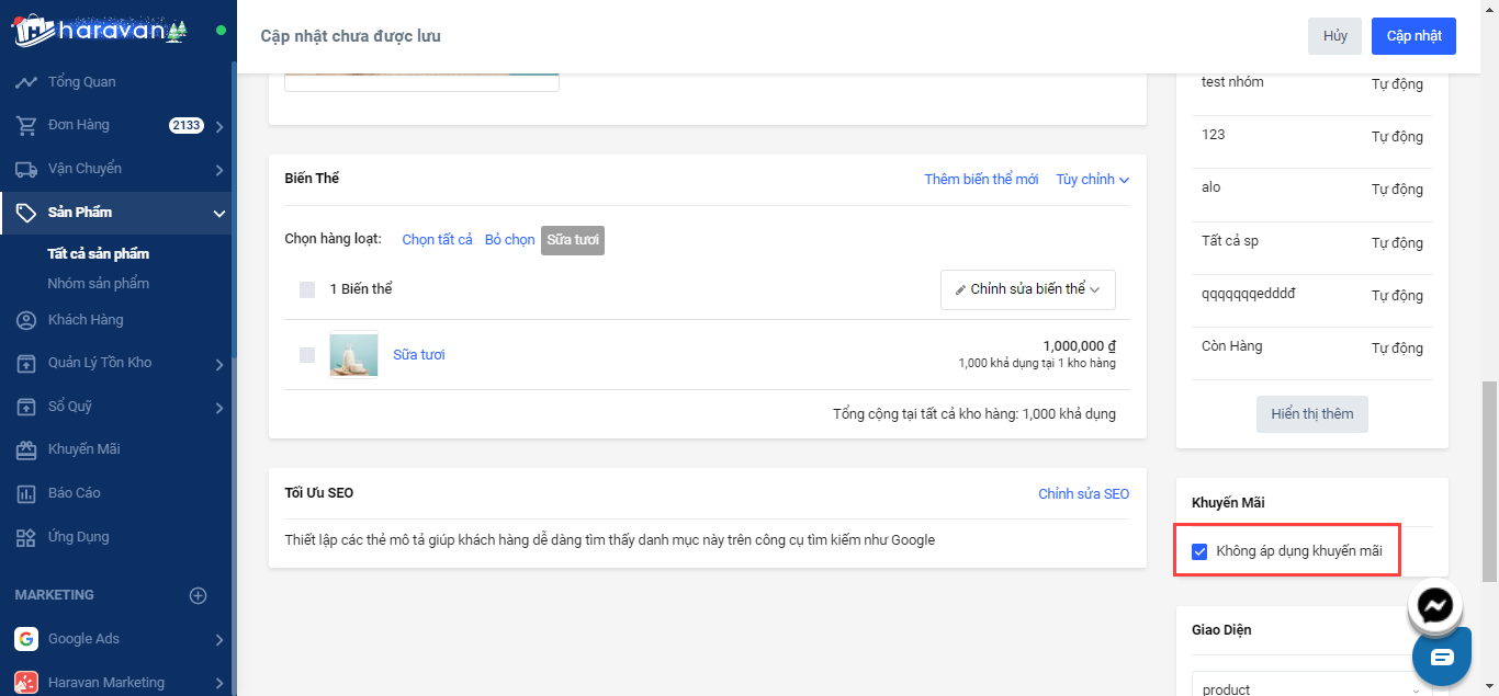 - Chứa sản phẩm với điều kiệnKhông áp dụng khuyến mãi (theo cấu hình sản phẩm trên trang quản trị Haravan)