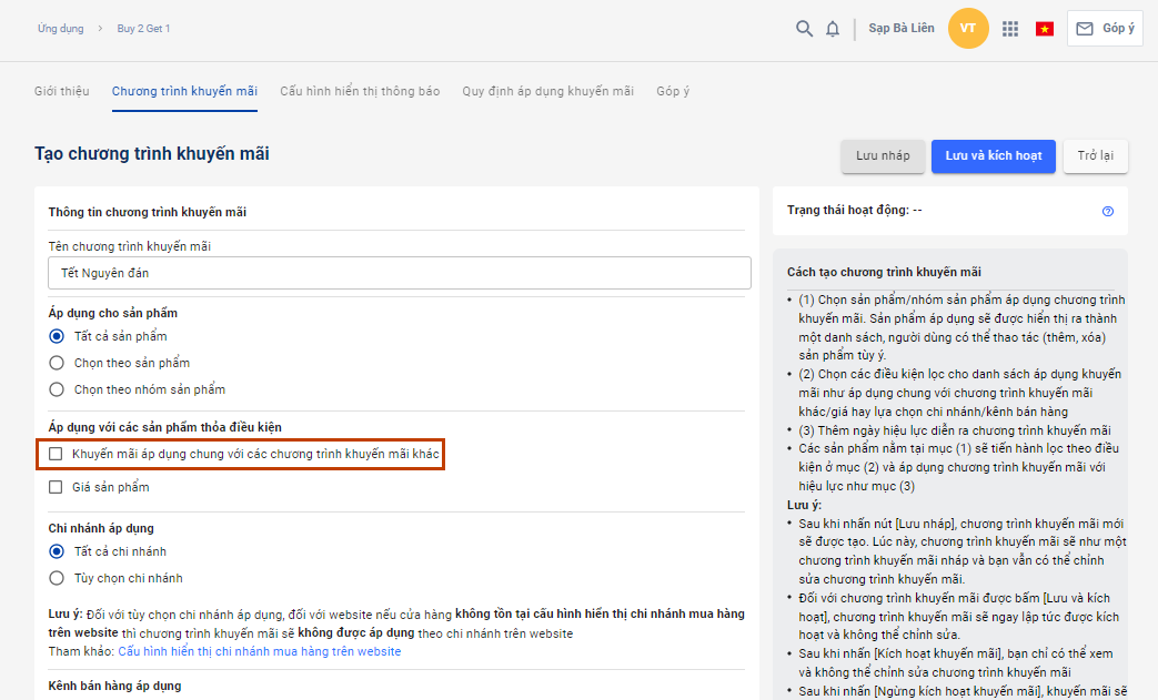 - Khi không chọn Áp dụng chung với các chương trình khuyến mãi khác, các sản phẩm đạt điều kiện được khuyến mãi của cả hai CTKM sẽ không được áp dụng chương trình Mua 2 Tặng 1 (chỉ giữ lại CTKM được tạo trên trang quản trị đã áp dụng trước đó)