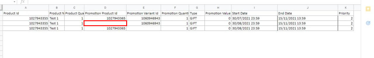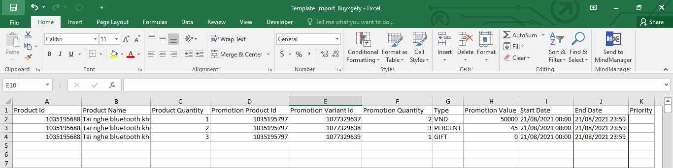 Khi nhập file dữ liệu để tạo chương trình Mua X tặng Y giảm theo biến thể, các cộtproduct id, product name, product quantity, promotion product id, promotion quantity không được bỏ trống. File Excel khi sau khi đã nhập dữ liệu chương trình “Mua X Tặng Y” thành công