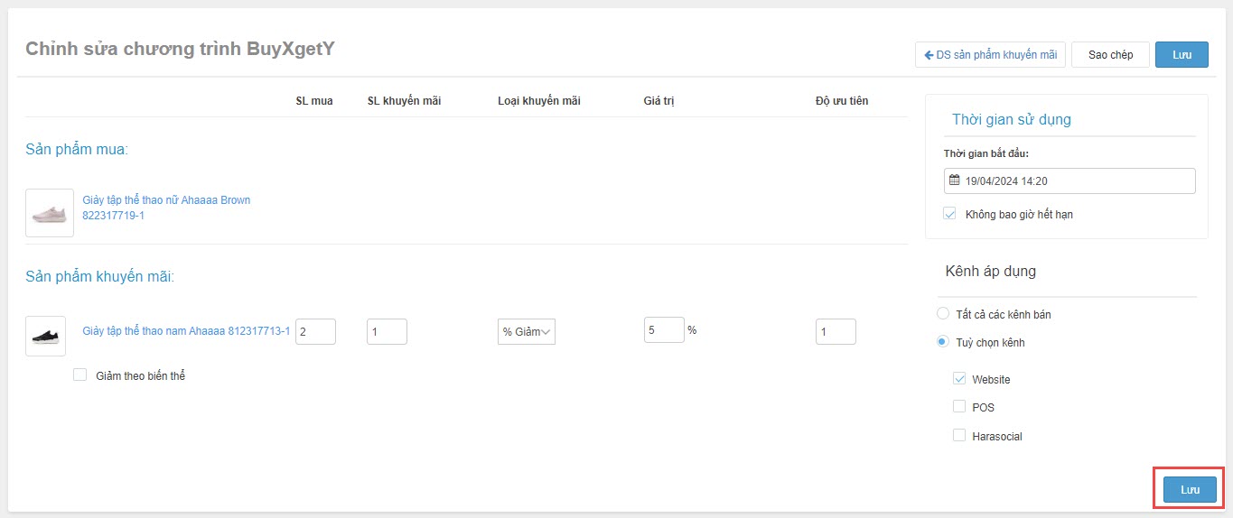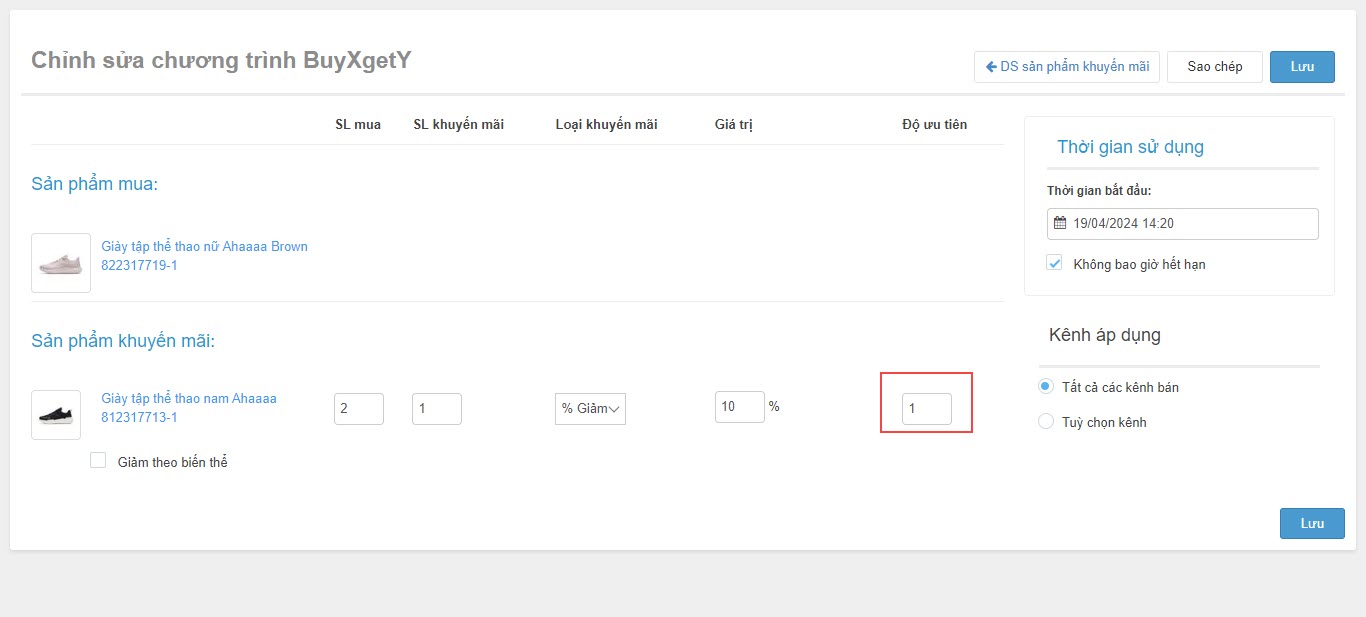Bước 3: Nhà bán hàng nhập thông tin chỉnh sửa thông tin được sao chép (SL mua, SL khuyến mãi, Loại khuyến mãi, Giá trị, Độ ưu tiên), thời gian hiệu lực, nhấn nút “Lưu”.