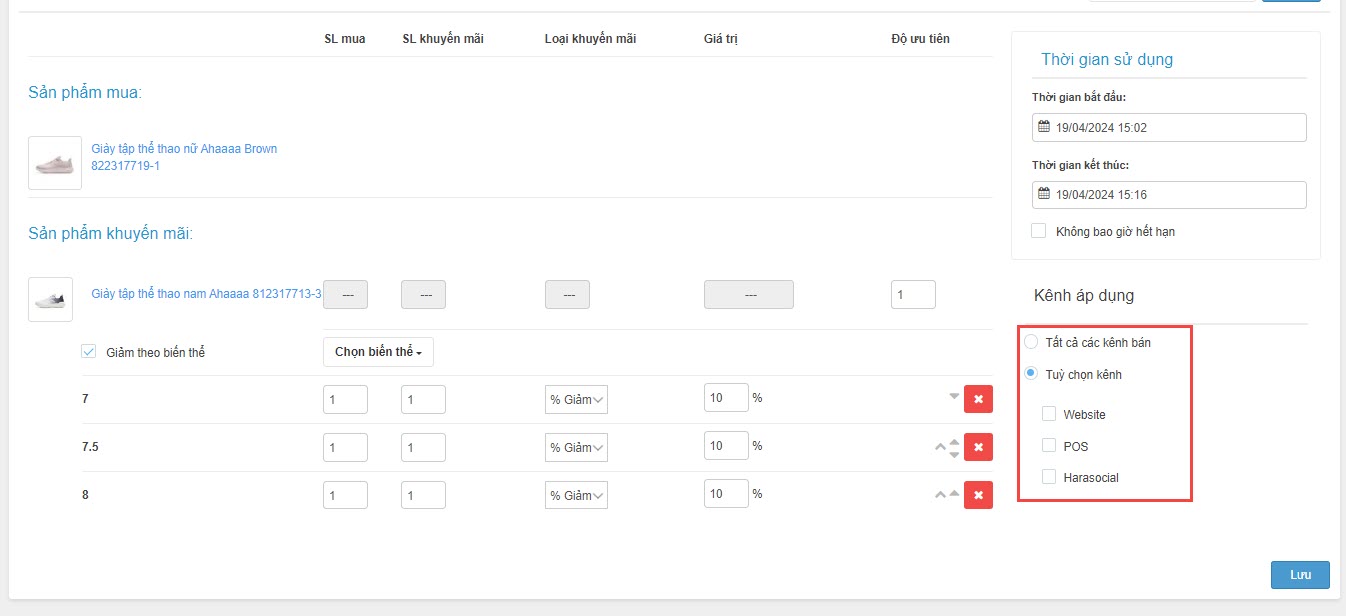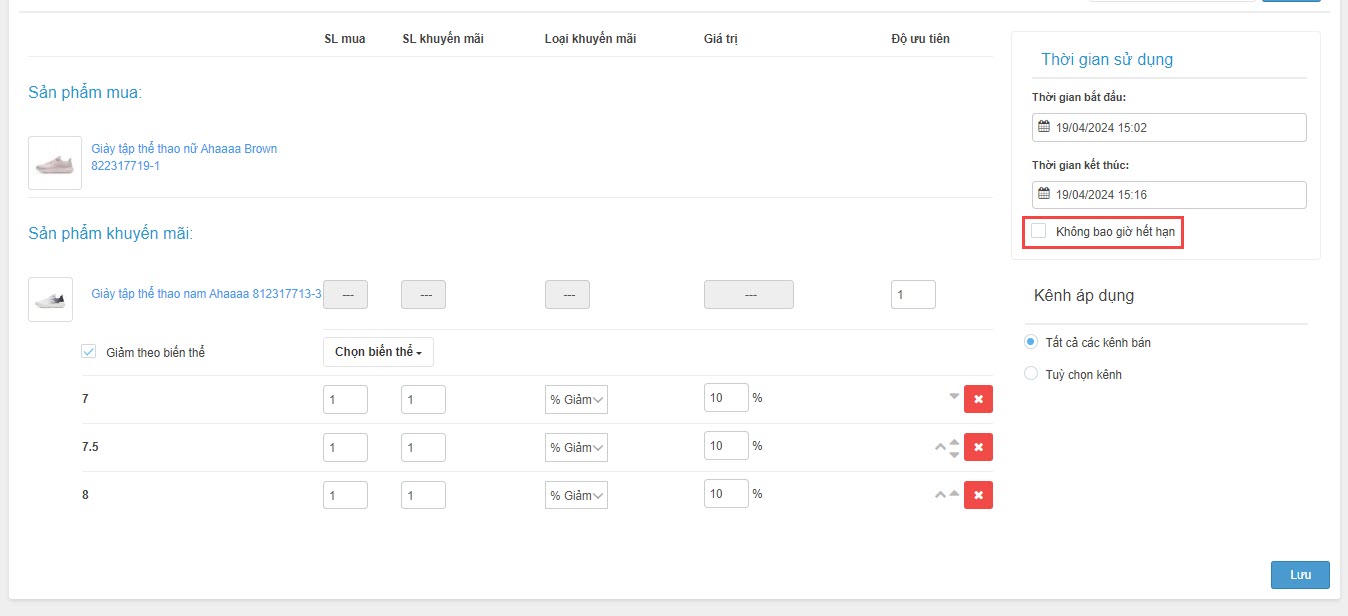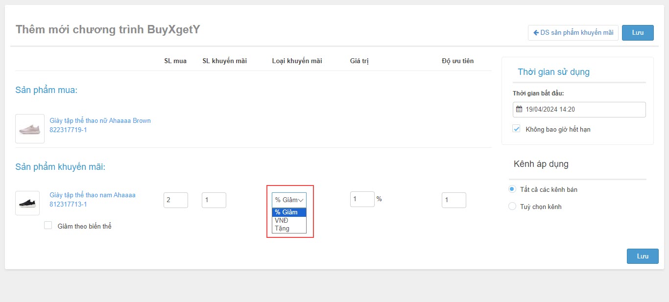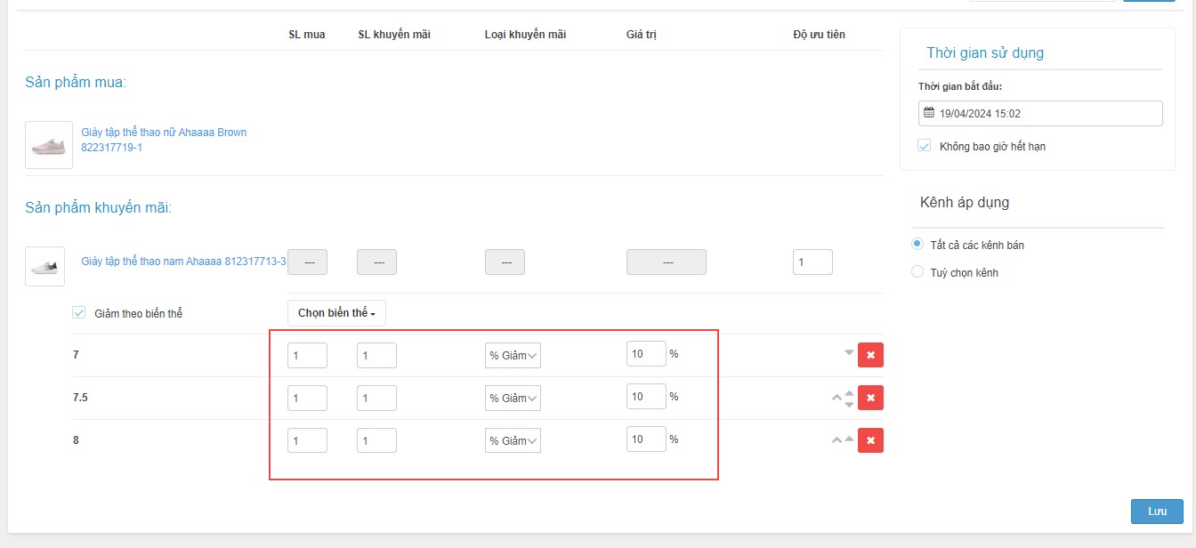 Bước 2 Nhà bán hàng lần lượt thiết lập số lượng mua, số lượng tặng, loại khuyến mãi và giá trị khuyến mãicho từng biến thể.