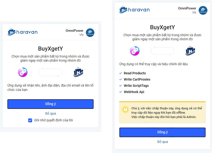 - Hệ thống hiển thị popup kết nối ứng dụng Mua X Tặng Y, Nhà bán hàng chọn Đồng ý 2 lần như hình sau
