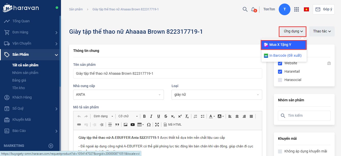 Bước 2: Trong trang chi tiết của sản phẩm, Nhà bán hàng chọn Ứng dụng. Tại đây, Nhà bán hàng chọn ứng dụng Mua X Tặng Y.