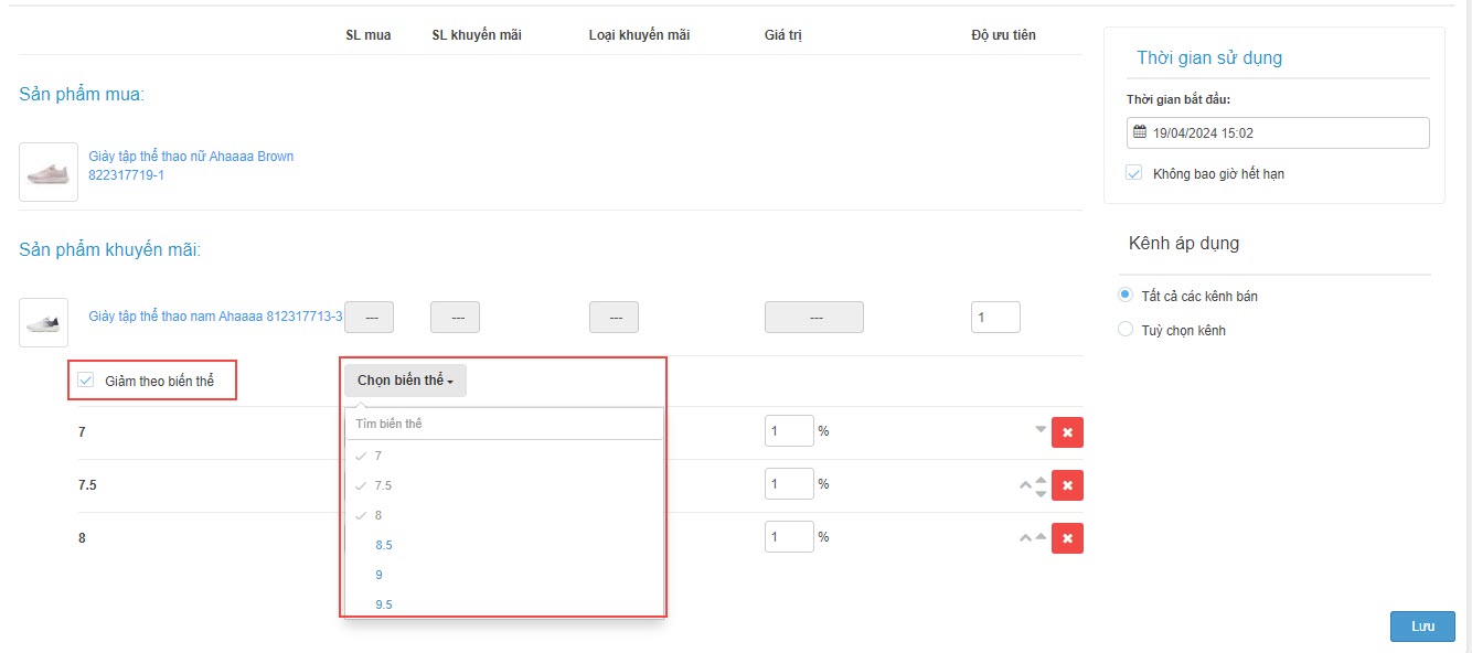 - Độ ưu tiên của biến thể áp dụng theo vị trí của dòng biến thể trong danh sách biến thể áp dụng khuyến mãi. Biến thể ở trên cùng có độ ưu tiên cao nhất.