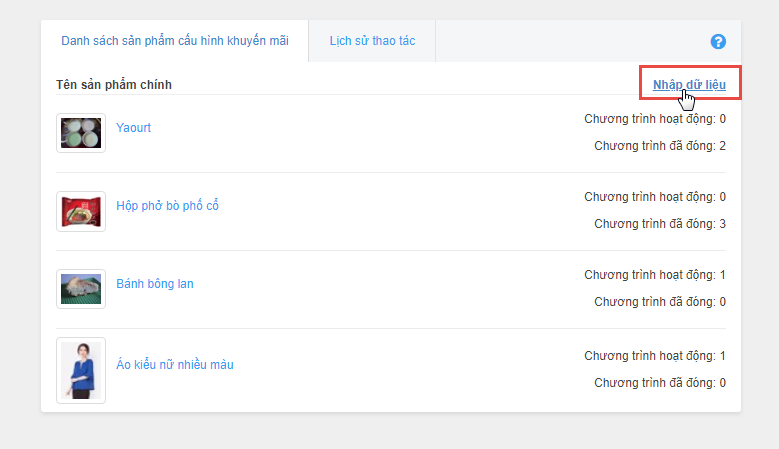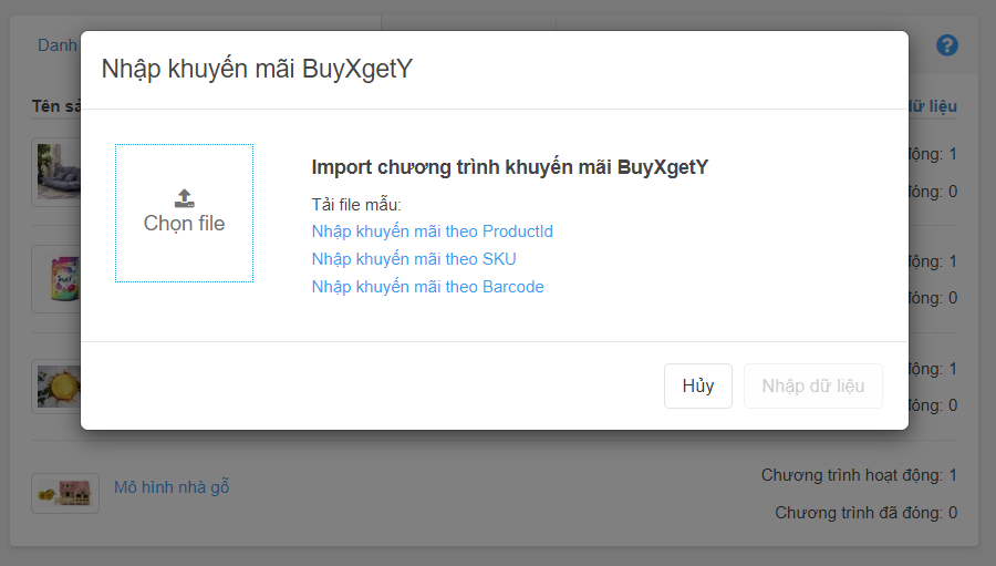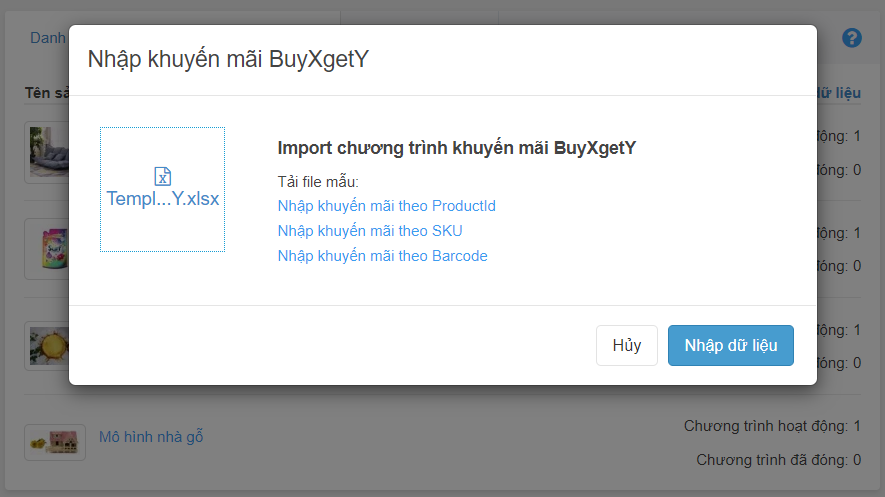 Để tải tệp tin mẫu import chương trình “Mua X Tặng Y”, Nhà bán hàng nhấp chọn đường dẫn “Nhập dữ liệu” tại màn hình “Danh sách sản phẩm cấu hình khuyến mãi”