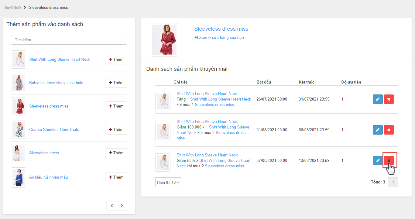 - CT3: Mua 1 áo sơ mi X’ giảm 50% khi mua bộ trang sức đi tiệc Z, chương trình được tạo vào lúc 01/09/2021 09:45:00.