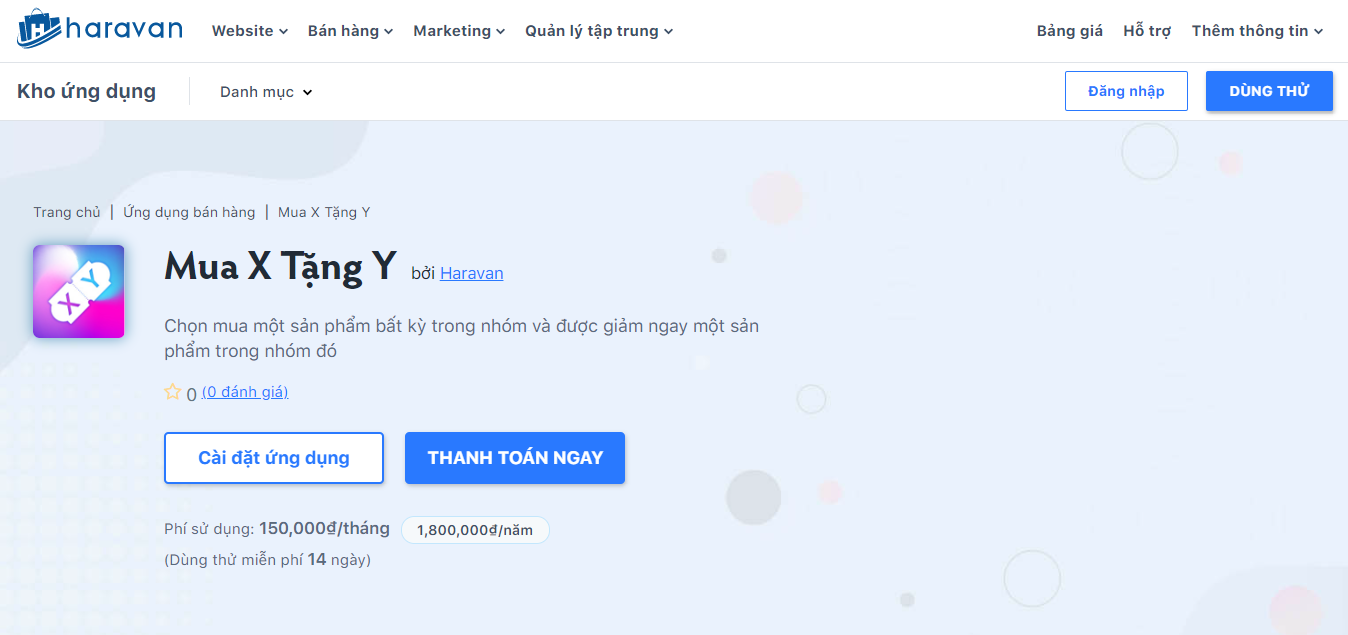Ứng dụng Mua X Tặng Y do nhóm Haravan phát triển, với mức phí sử dụng là 150.000đ/tháng. Nhà bán hàng có thể dùng thử trước 15 ngày trước khi chính thức sử dụng.