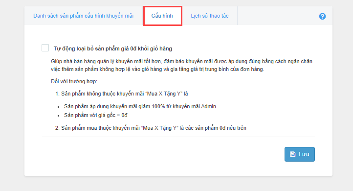 Cấu hình này sẽ chặn không cho thêm các sản phẩm không hợp lệ vào giỏ hàng (sản phẩm có giá 0đ). Tuy nhiên, nếu nhà bán hàng muốnchạy khuyến mãi khuyến mãi tặng sản phẩm dùng thử hoặc áp dụng nhiều loại khuyến mãi mua sản phẩm tặng sản phẩm khác nhau, bạn có thể tắt cấu hình này.
