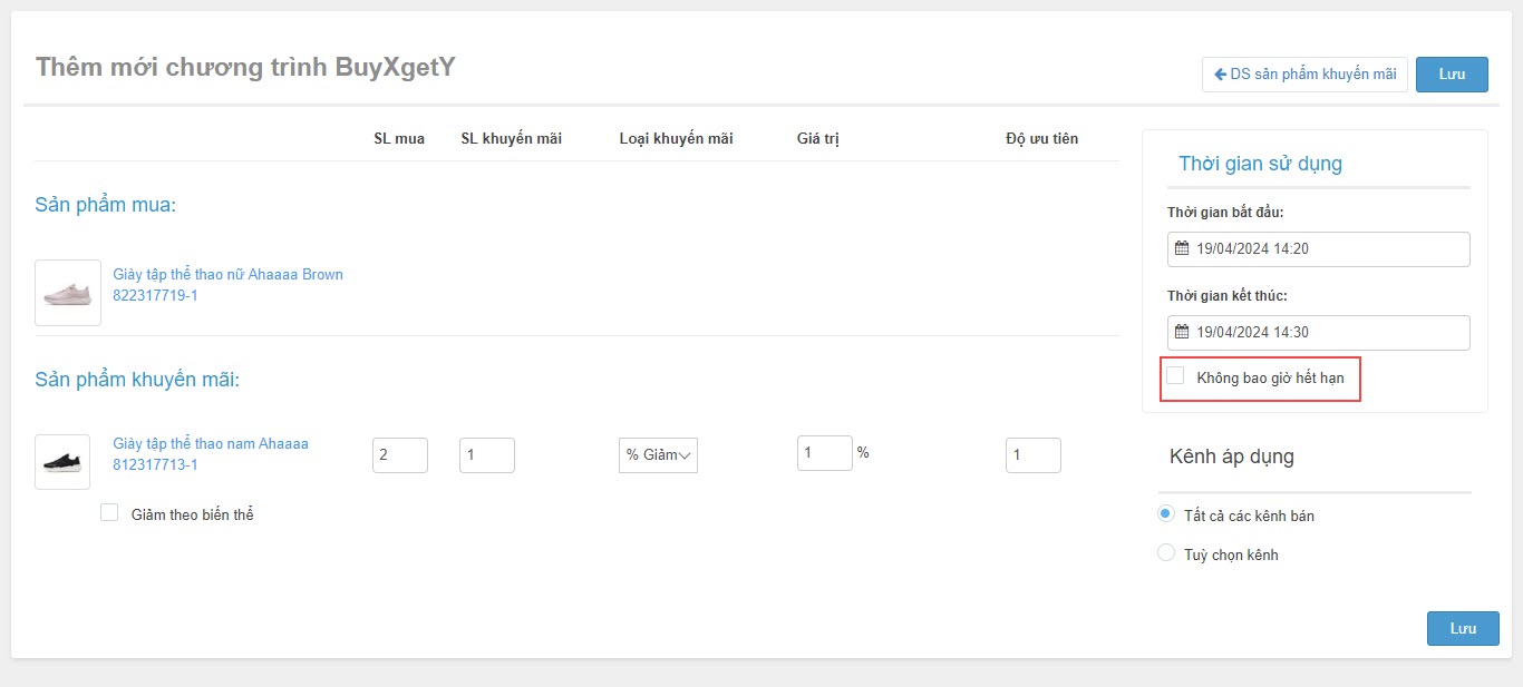 Nếu chương trình không có thời gian kết thúc, chọn Không bao giờ hết hạn.