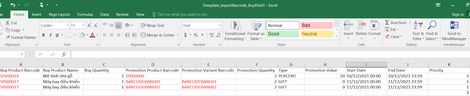 | Promotion Variant Barcode | Barcode của biến thể khuyến mãi (Biến thể tặng) Định dạng Number _ Chỉ nhập dữ liệu nếu chương trình áp dụng theo biến thể _ Chương trình có nhiều biến thể thì tạo nhiều dòng, mỗi dòng ghi nhận 1 Barcode biến thể khác nhau. * Các Barcode thuộc cùng một chương trình phải cùng một sản phẩm khuyến mãi. |