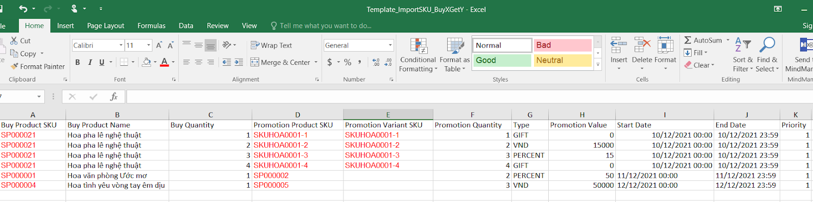 | Promotion Variant SKU | SKU của biến thể khuyến mãi (Biến thể tặng) Định dạng Number _ Chỉ nhập dữ liệu nếu chương trình áp dụng theo biến thể _ Chương trình có nhiều biến thể thì tạo nhiều dòng, mỗi dòng ghi nhận 1 SKU biến thể khác nhau. * Các SKU thuộc cùng một chương trình phải cùng một sản phẩm khuyến mãi. |
