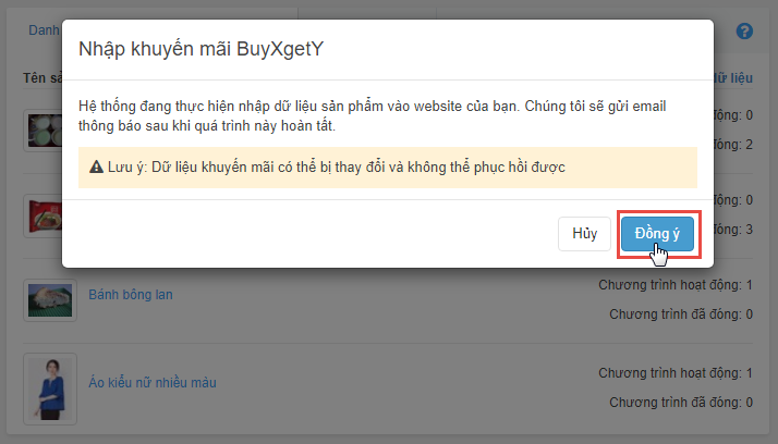 Nhà bán hàng nhấn tiếp nút “Đồng ý” tại màn hình xác nhận đồng ý thêm mới chương trình “Mua X Tặng Y” từ dữ liệu trong tệp tin mẫu đã tải lên.