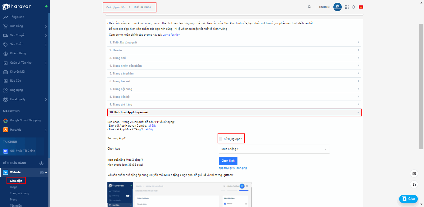 Để hiển thị khuyến mãi đã tạo ra website, bạn vào Website -> Giao diện -> Thiết lập theme. Bạn kéo xuống và chọn mục Kích hoạt App khuyến mãi. Tại đây bạn tick chọn vào ô Sử dụng app.