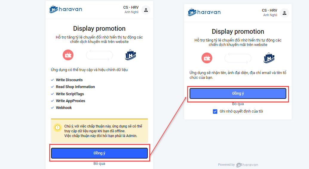 Hệ thống hiển thị popup kết nối ứng dụng Display Promotion, Nhà bán hàng chọn Đồng ý