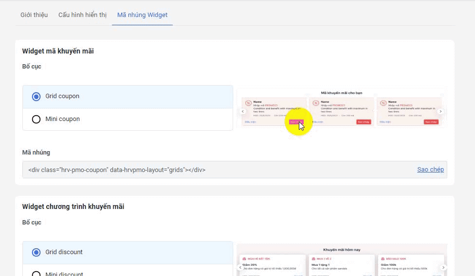 - Tại menu Mã nhúng Widget, nhà bán hàng chọn layout mã khuyến mãi hoặc chương trình khuyến mãi, mỗi layout sẽ có đoạn mã widget riêng