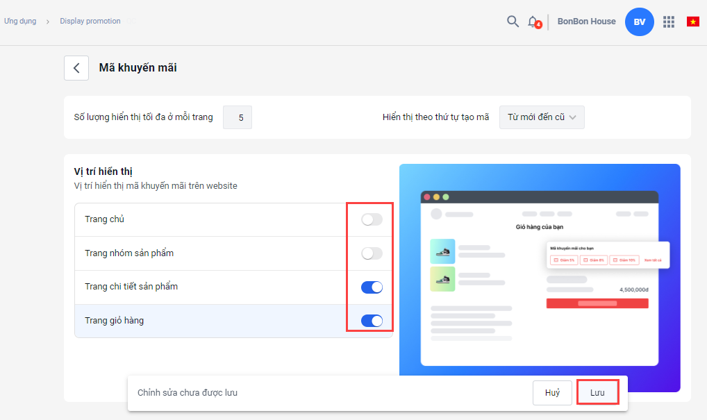 - Chọn Thiết lập để chọn trang hiển thị mã khuyến mãi/ chương trình khuyến mãi (trang chủ, trang nhóm sản phẩm, trang chi tiết sản phẩm, trang giỏ hàng) -> chọn Lưu để lưu thay đổi