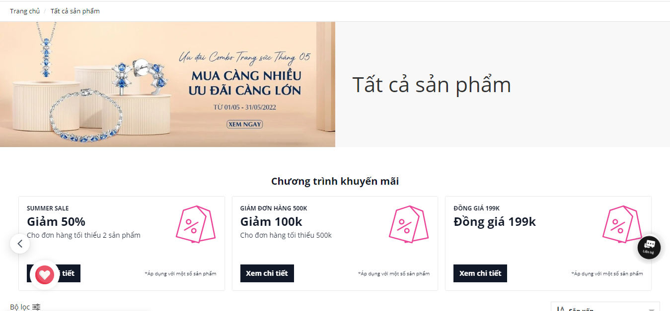 | Nhóm sản phẩm | * Hiển thị tối đa 5 mã khuyến mãi và 5 chương trình khuyến mãi thỏa điều kiện: + Có trạng thái Đang khuyến mãi + Được tạo gần nhất + Các khuyến mãi áp dụng cho Nhóm sản phẩm đang xem + Mã khuyến mãi và chương trình khuyến mãi có bật Hiển thị trên website Lưu ý: Nếu khuyến mãichỉ áp dụng cho một vài sản phẩm trong nhóm sản phẩm (không phải áp dụng cho toàn bộ nhóm sản phẩm) thì khuyến mãi cũng sẽ không hiển thị trên trang nhóm sản phẩm |