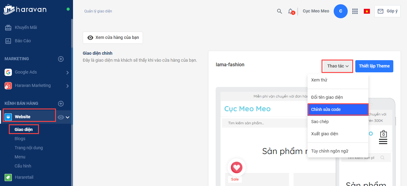 Thực hiện gắn code bằng cách vào Giao diện trong menu Website -> chọn Thao tác tại giao diện chính -> chọn Chỉnh sửa code