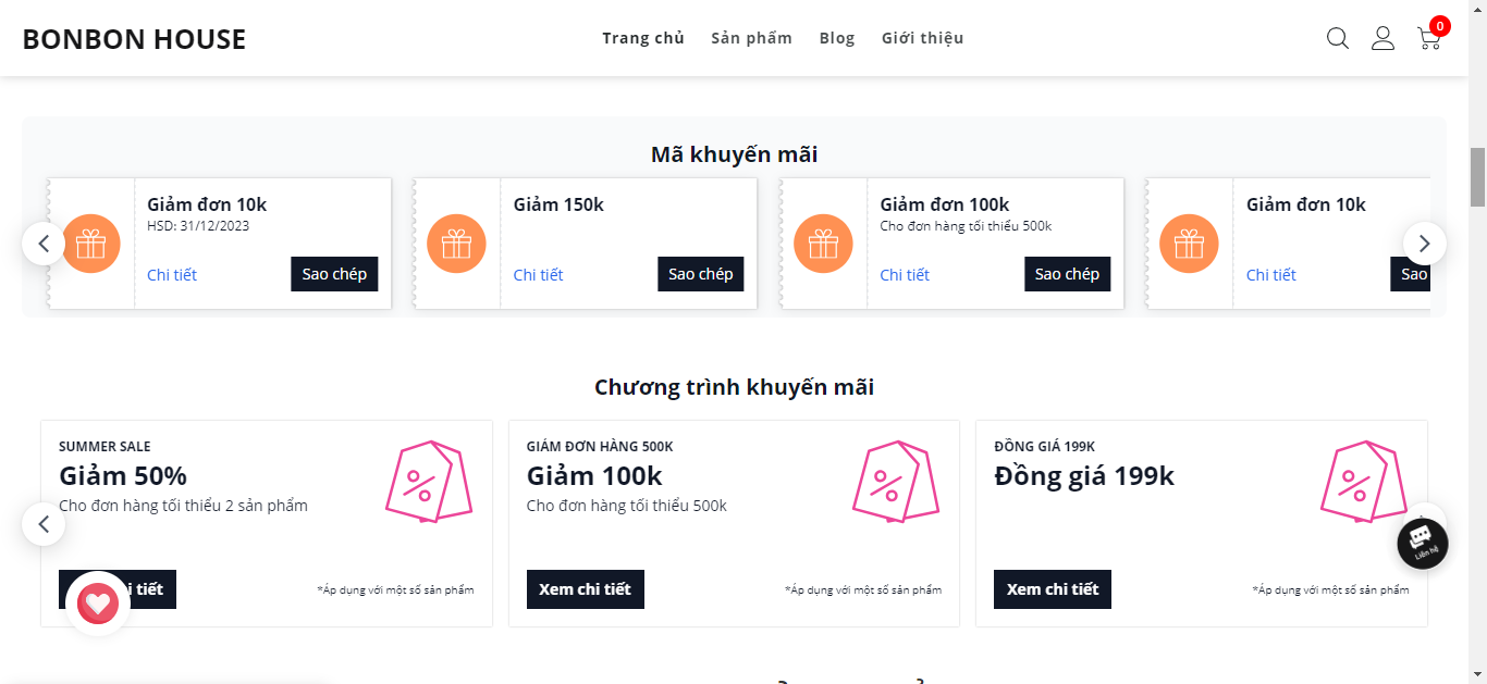 | Trang chủ | * Hiển thị tối đa 5 mã khuyến mãi và 5 chương trình khuyến mãi thỏa điều kiện + Có trạng thái Đang khuyến mãi + Được tạo gần nhất + Mã khuyến mãi và chương trình khuyến mãi có bật Hiển thị trên website |