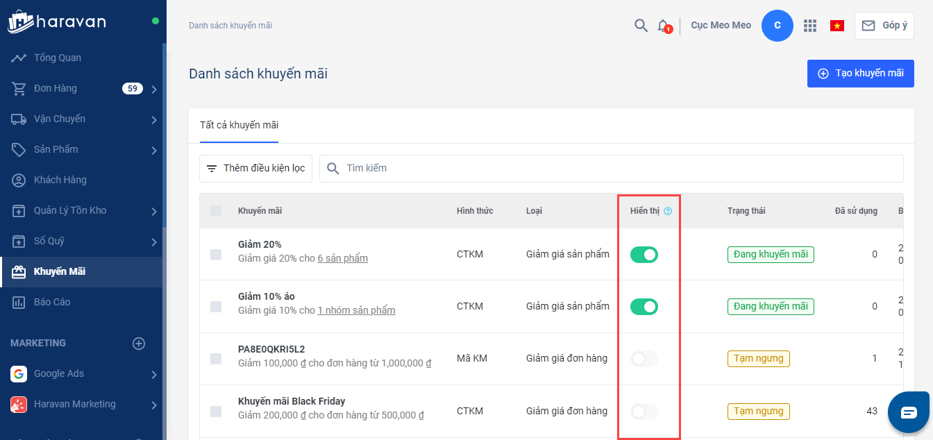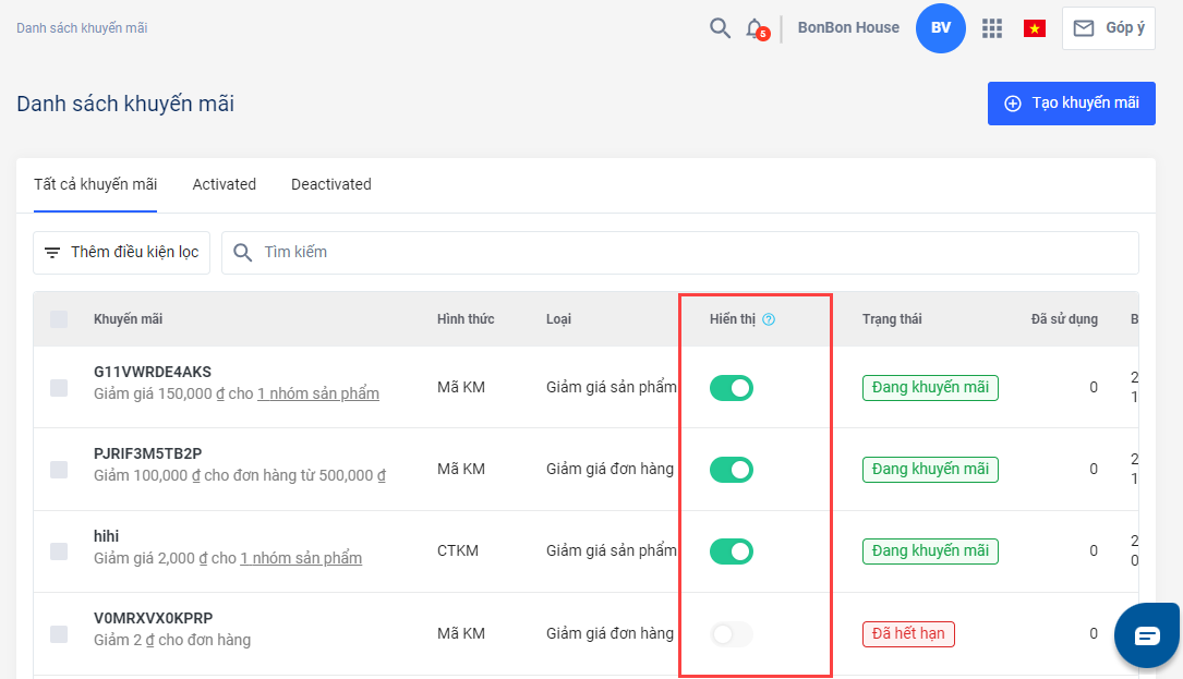 Bước 4: Tạo mã khuyến mãi/chương trình khuyến mãi và bật chế độ hiển thị trên website