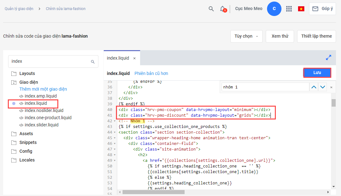 * Trang chủ: gắn vào thẻ index.liquid