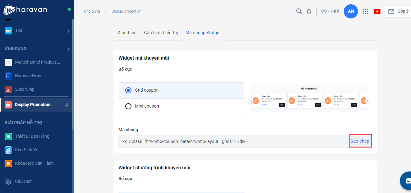 Bước 3: Copy và gắn Widget vào các vị trí muốn hiển thị mã khuyến mãi/chương trình khuyến mãi