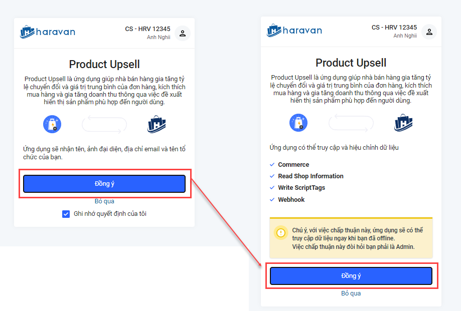 Hệ thống hiển thị popup kết nối ứng dụng , Nhà bán hàng chọn Đồng ý