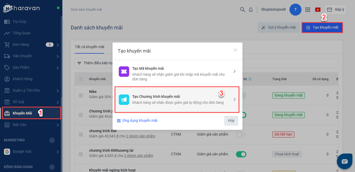 Nhà bán hàng thực hiện tạo chương trình khuyến mãi trong mục Khuyến mãi. Xem hướng dẫn tạo chương trình khuyến mãi tại đây