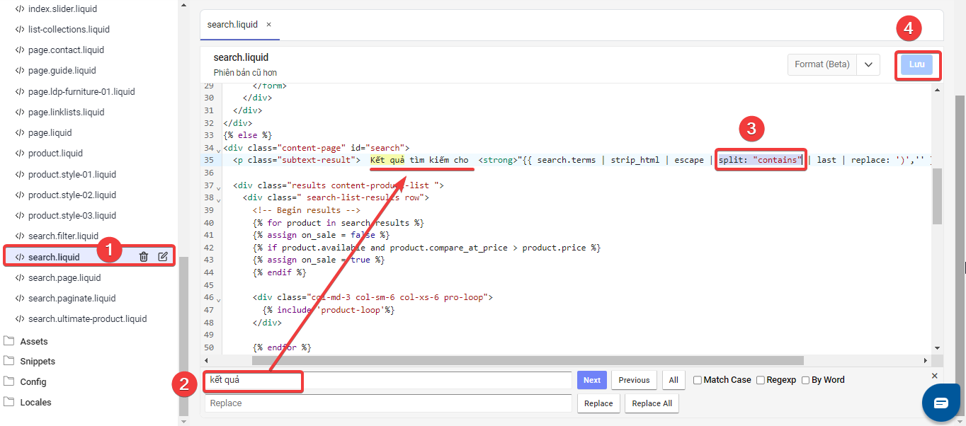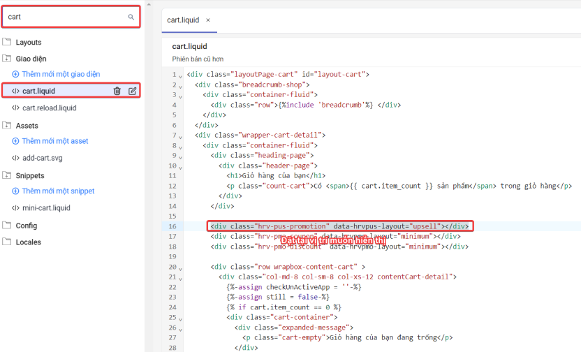 - Đối với Upsell: Tìm kiếm thẻ cart.liquid và dán vào vị trí bất kỳ mà bạn muốn hiển thị