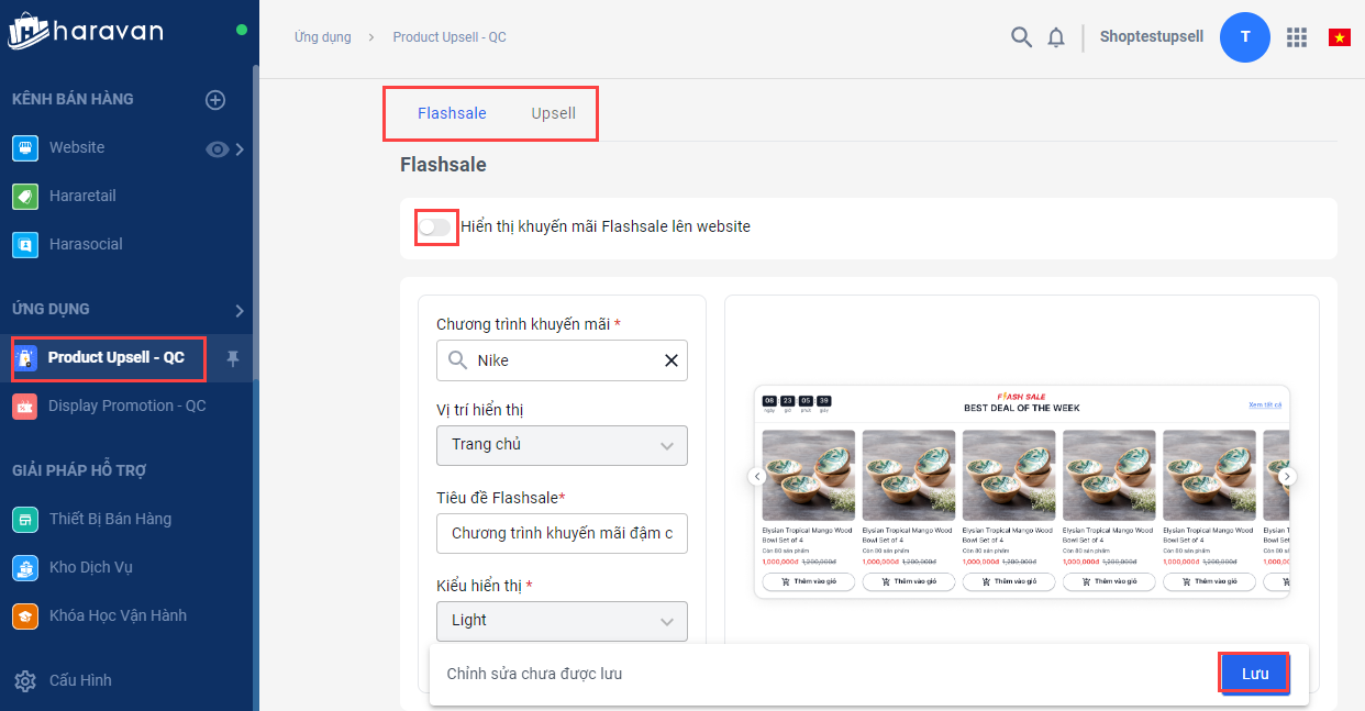 Trong các trường hợp trên, để ẩn khuyến mãi , Nhà bántruy cập vào ứng dụng Product Upsell và thực hiện tắt Hiển thị khuyến mãi Upsell / Flash sale lên website -> chọn Lưu để hoàn tất