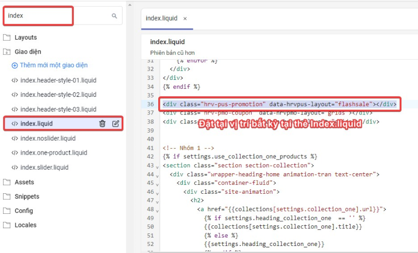- Đối với Flashsale: Tìm kiếm thẻ index.liquid và dán vào vị trí bất kỳ mà bạn muốn hiển thị