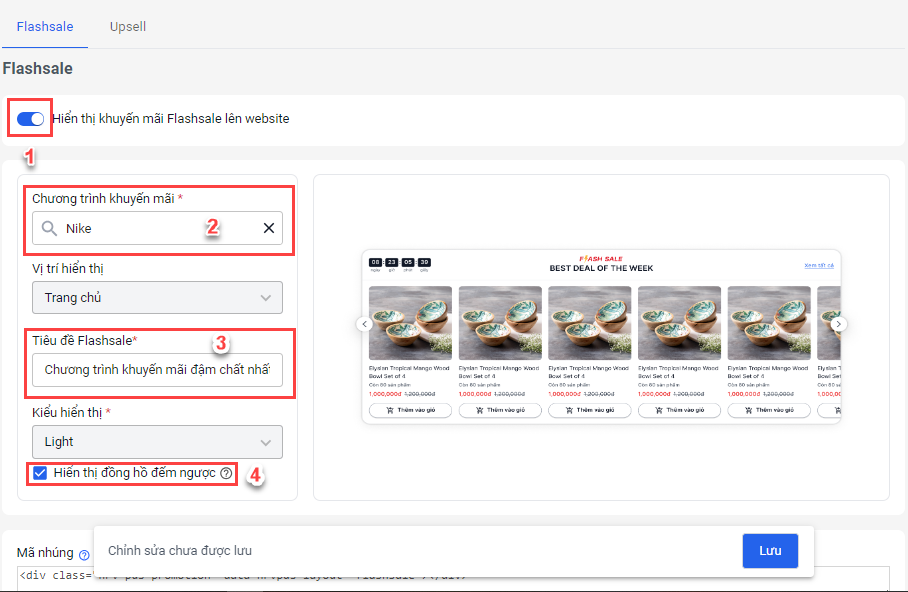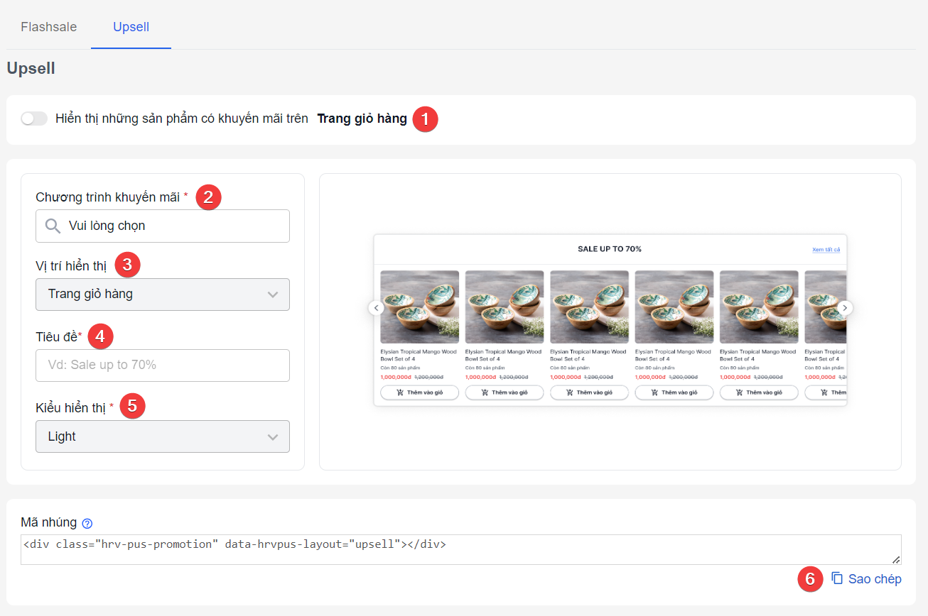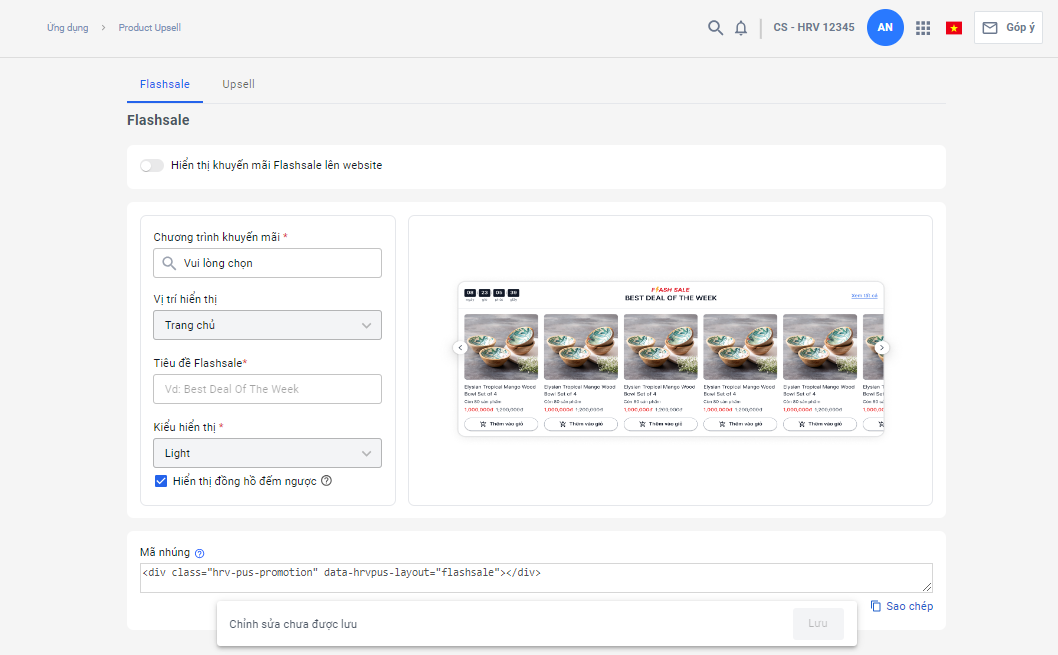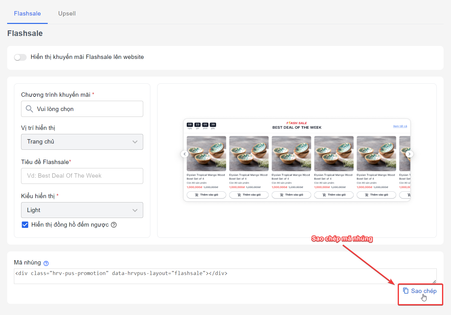 - Đăng nhập vào ứng dụng Product Upsell và sao chép mã nhúng tại mục Flashsale hoặc Upsell
