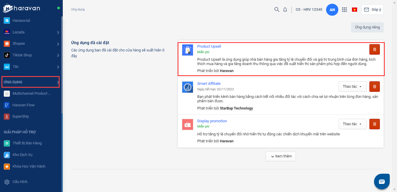 Nhà bán hàng truy cập vào link https://apps.haravan.com/products/product-upsell