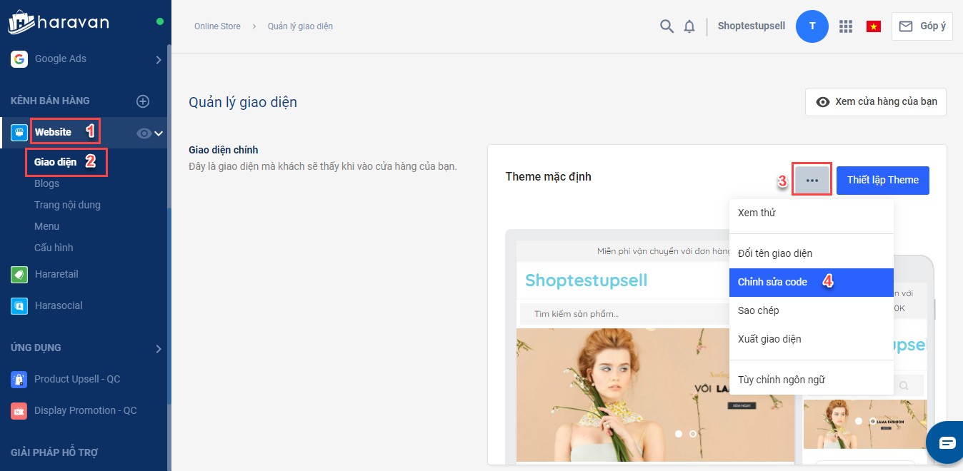 - Vào Kênh bán hàng, bạn chọn Website -> chọn Giao diện > chọn biểu tượng**…** và chọn**Chỉnh sửa code**