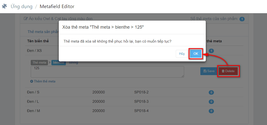 Người bán nhấp chọn vào biến thể chứa thẻ meta cần xóa.
