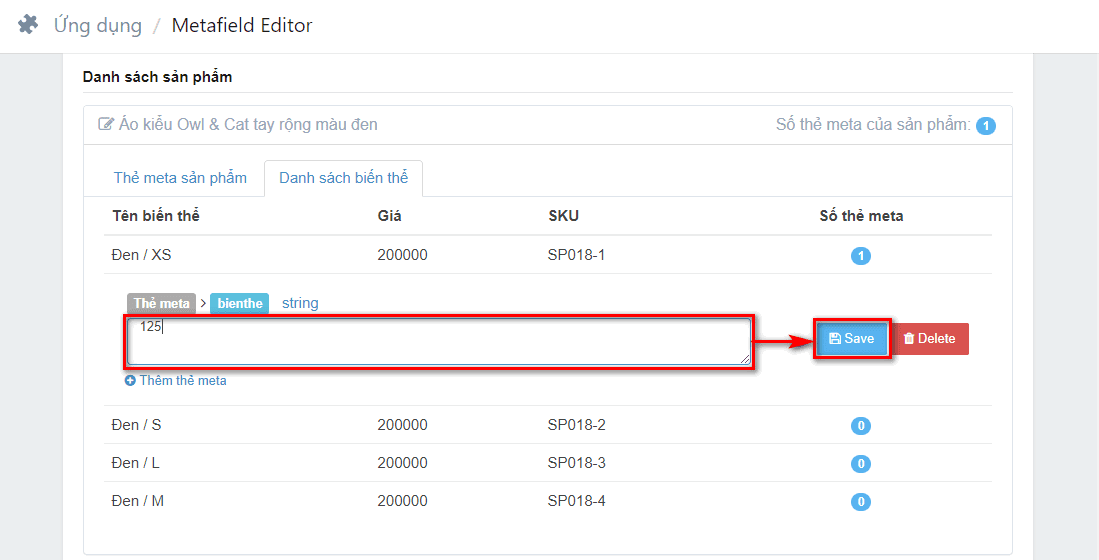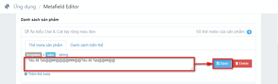 Người bán vào vị trí thẻ meta cần sửa (sản phẩm/biển thể) và thực hiện chỉnh sửa, sau đó nhấn Save để lưu.