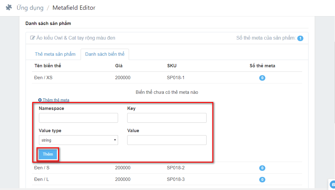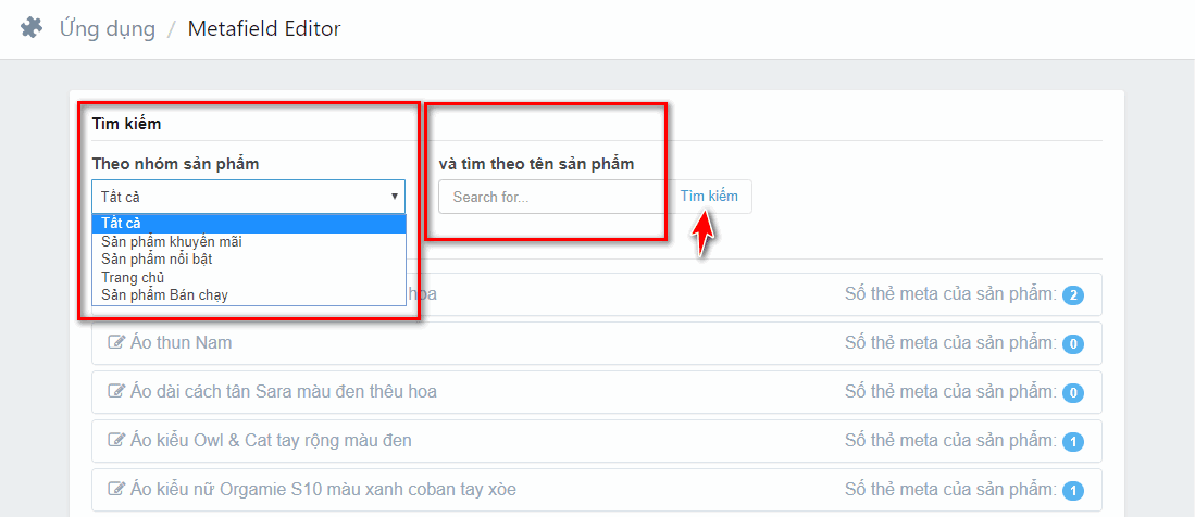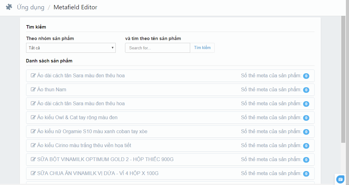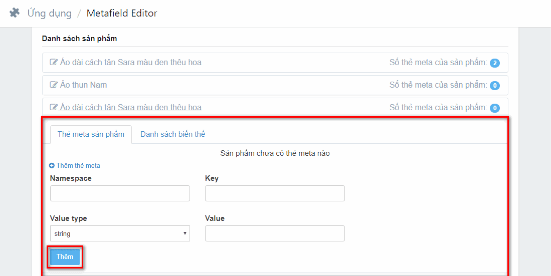Sau khi cài đặt ứng dụng, người bán vào trang giao diện của ứng dụng MetaFields Editor để sử dụng.
