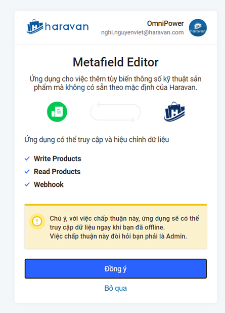 Hệ thống điều hướng về Trang quản trị Haravan. Tại đây, người bán chọn "Đồng ý" hai lần liên tiếp.