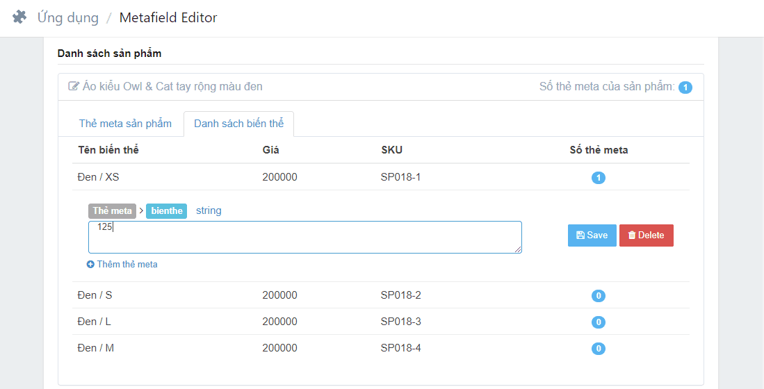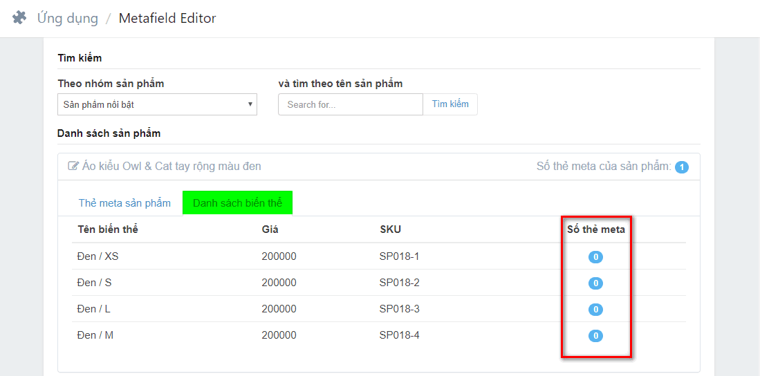 Số thẻ meta của biển thể được thể hiện tại vị trí Số thẻ meta trong tab Danh sách biến thể.